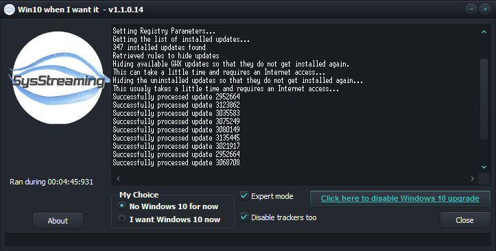 And there's more: it is not unusual for up to 6GB of data (Windows 10 installation files) to be downloaded and installed on your local hard disk drive At SysStreaming, we believe that users should have the freedom to choose what gets installed and downloaded on their devices. This is why we have created a very simple tool that automates the removal of "Get Windows 10 app" and that recovers the related disk storage.